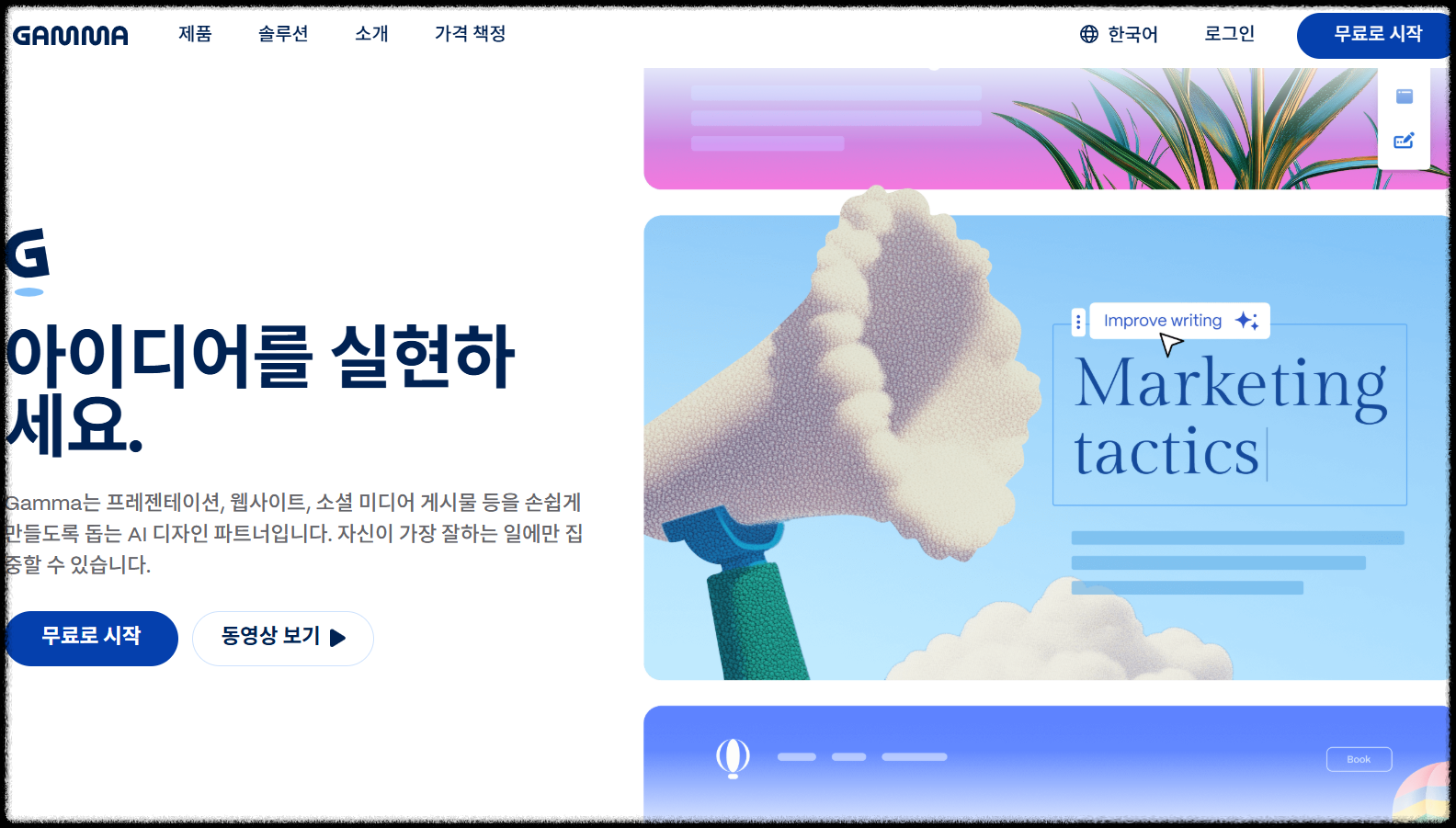 Gamma는 프레젠테이션, 웹사이트, 소셜 미디어 게시물 등을 손쉽게 만들도록 돕는 AI 디자인 파트너입니다.