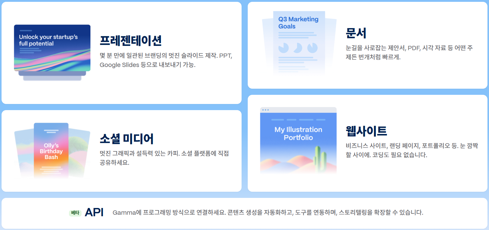 감마 AI는 프레젠테이션뿐만 아니라 웹페이지나 문서 등을 한 번에 만들 수 있는 AI 기반 콘텐츠 생성 툴입니다.